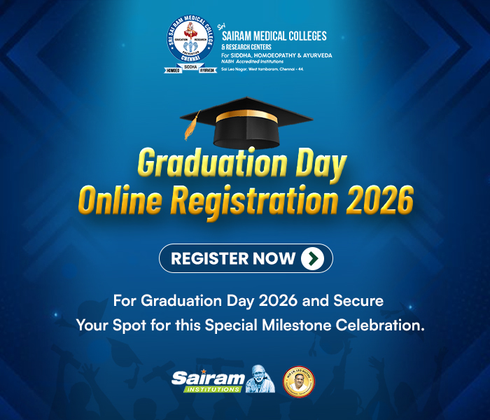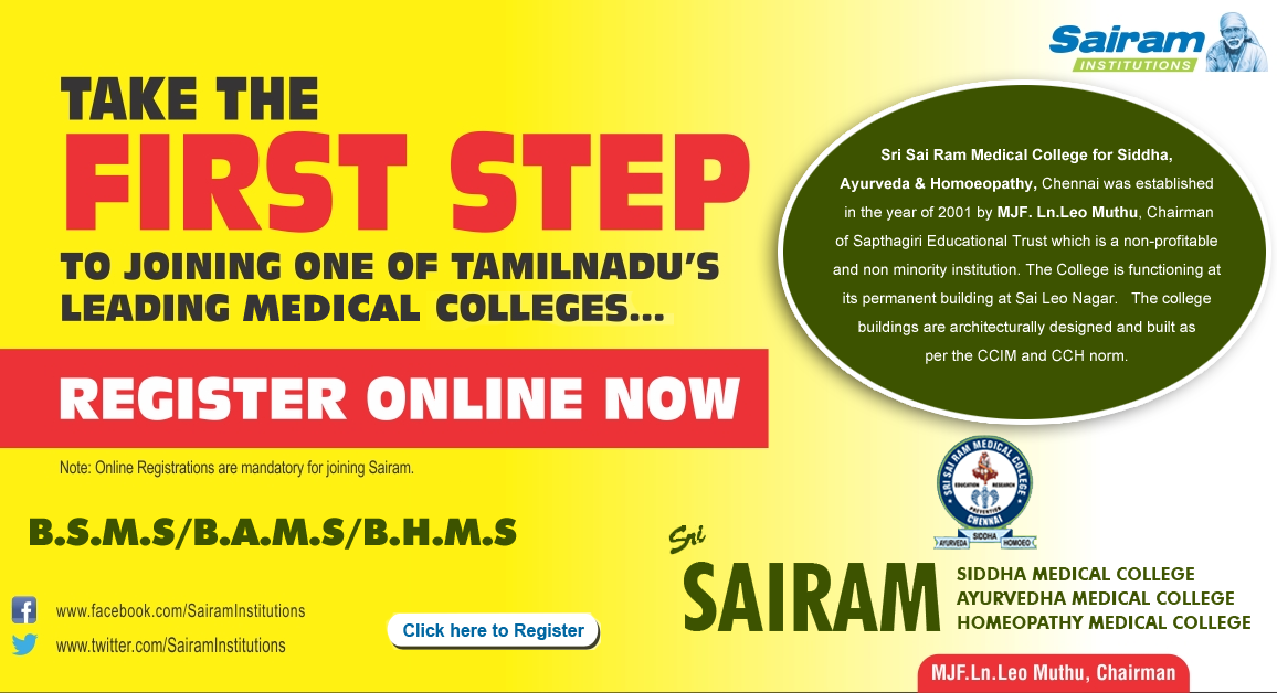 Sri Sai Ram Medical College for Siddha, Ayurveda & Homoeopathy, Chennai was established in the year of 2001 by MJF.Ln.Leo Muthu , Chairman of Sapthagiri Educational Trust which is a non-profitable and non minority institution. The College is functioning at its permanent building at Sai Leo Nagar. A Sprawling campus of 200 acres near to the well known tourist attraction "Kishkinta". The college buildings are architecturally designed and built as per the CCIM and CCH norm.